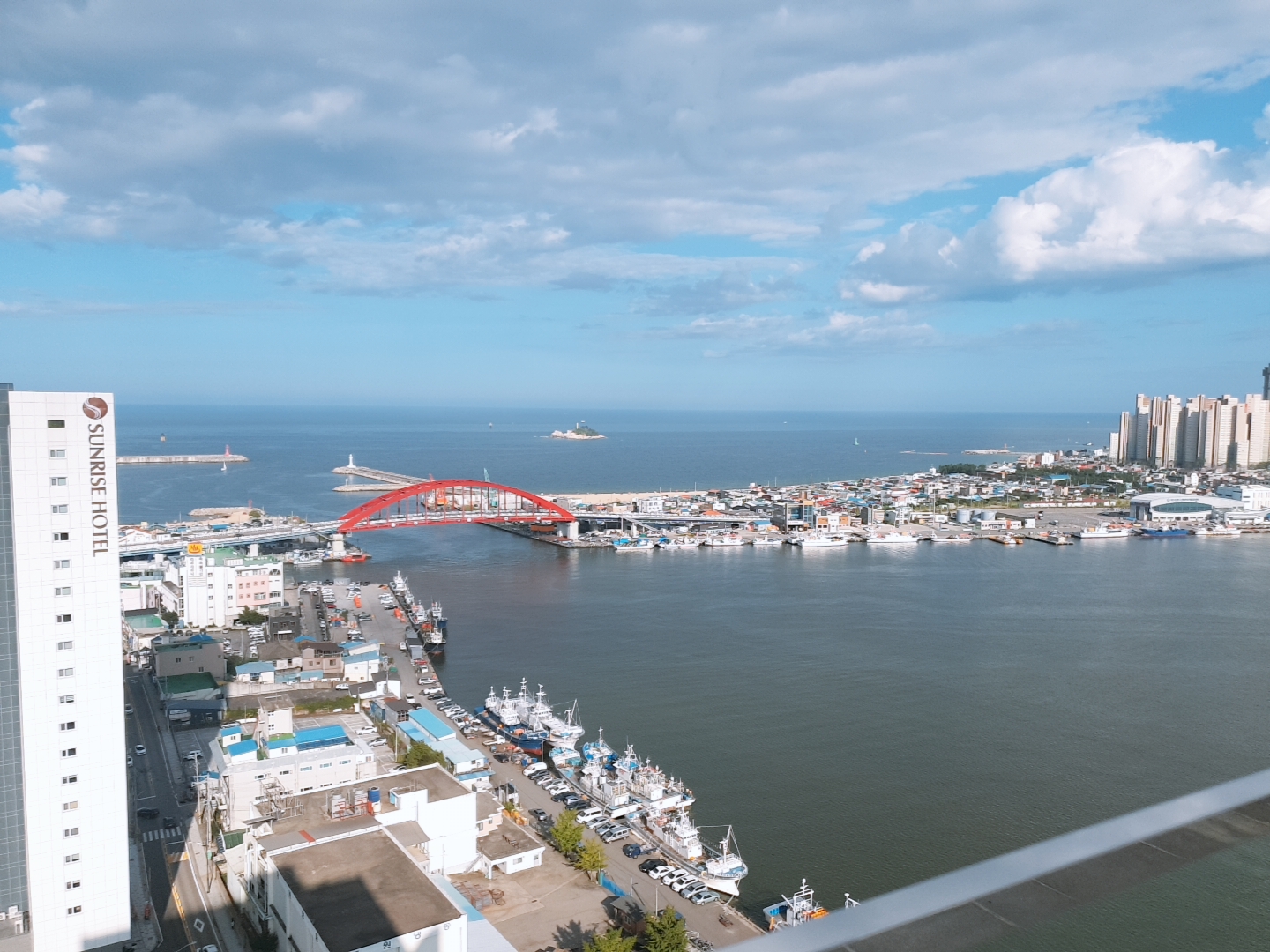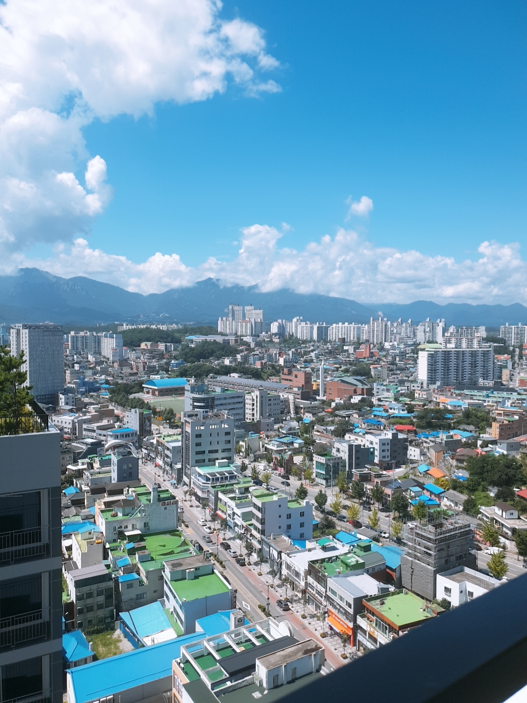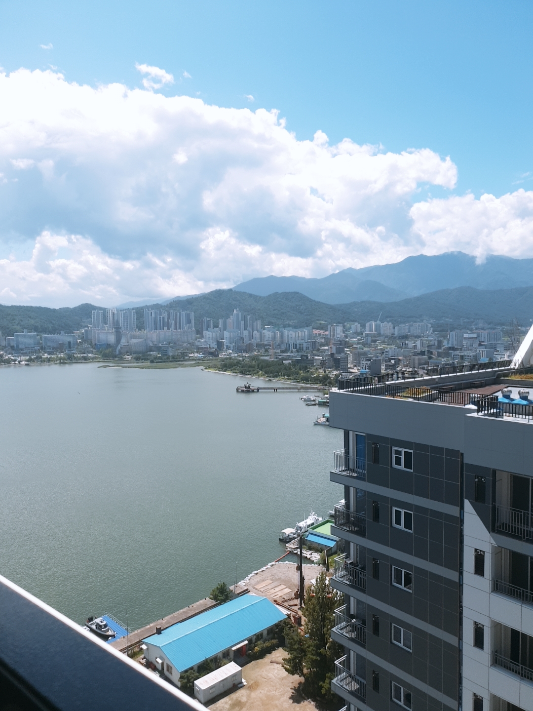 창문을 열어 테라스에서 밖의 전망을 찍었다. 날씨가 좋아서 그런지 하늘과 속초 전망이 너무 멋있었다. 우리는 비전망 방을 받았음에도 바다를 조금 볼 수 있었다. 바다 전망의 방은 정말 아름답다고 들었는데 나중에는 바다 전망으로 예약해야겠다~