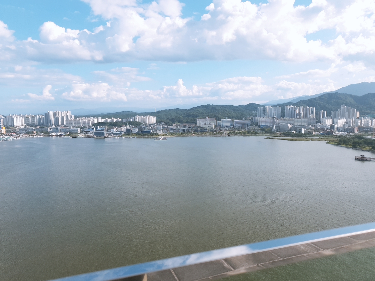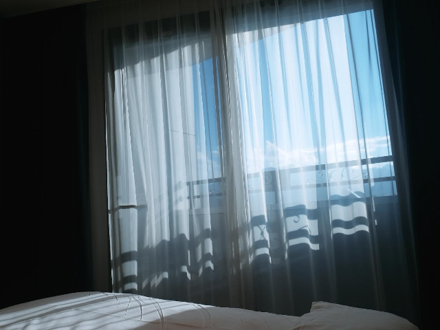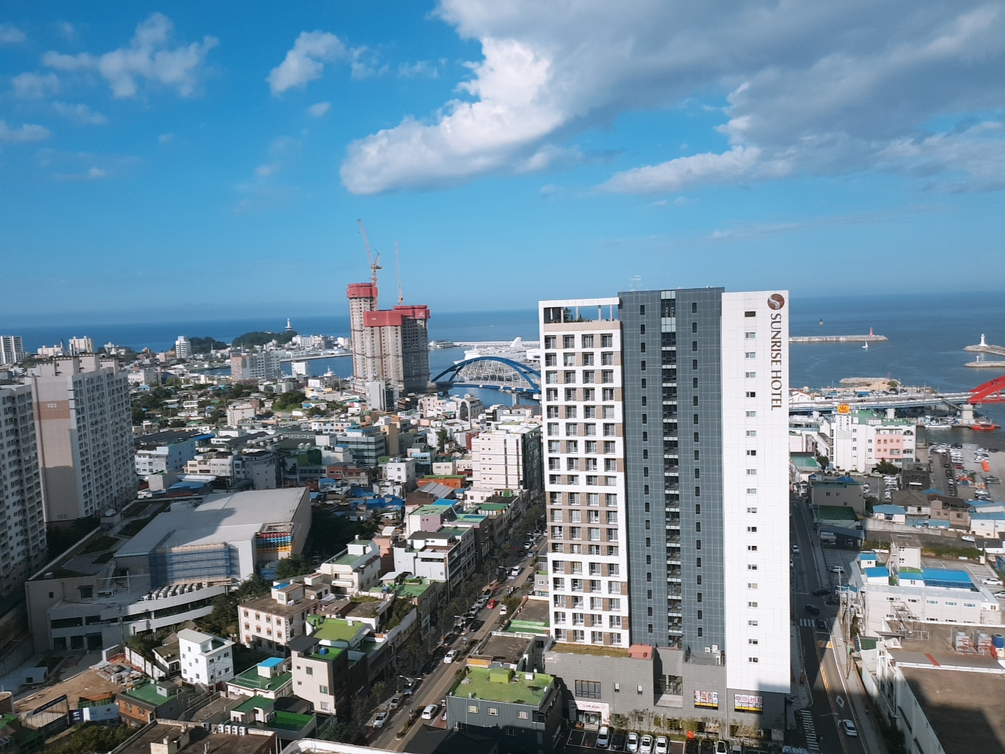 창문을 열어 테라스에서 밖의 전망을 찍었다. 날씨가 좋아서 그런지 하늘과 속초 전망이 너무 멋있었다. 우리는 비전망 방을 받았음에도 바다를 조금 볼 수 있었다. 바다 전망의 방은 정말 아름답다고 들었는데 나중에는 바다 전망으로 예약해야겠다~