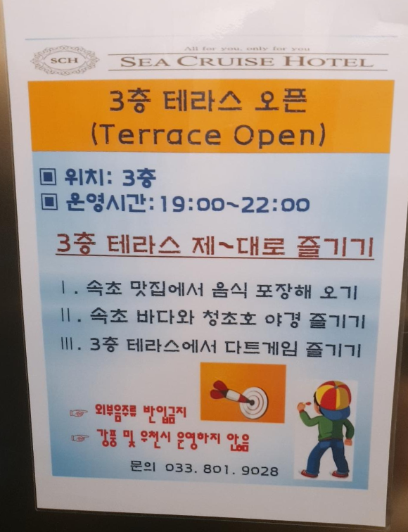속초의 가성비 최고의 호텔, 아름다운 바다 전망을 감상할 수 있는 호텔로 유명한 속초 씨크루즈 호텔. 가격에 비해 시설이 정말 괜찮았던 호텔이다.
